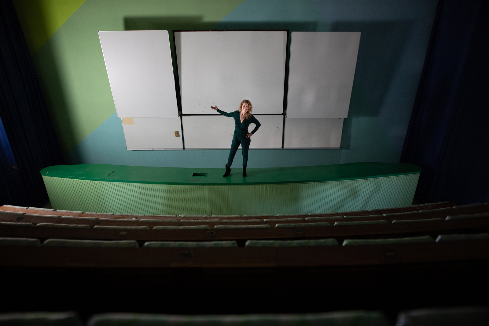 “Ik woonde in het Neherpark complex en jarenlang liep ik langs het Auditorium. Toen ik een keertje stiekem met mijn vriend (nu mijn man) het historische auditorium ben gaan bekijken was ik op slag verliefd. Sindsdien heb ik een alibi en ondersteuning gezocht om het auditorium in ere te herstellen. Nu, jaren veel gezwoeg, bureaucratie en geduld later, hebben we goedkeuring van de Rijksmonumentendienst en erfgoedcomissie en zijn we eigenaar geworden van dit Rijksmonument en gaan we weer baanbrekende dingen doen. Net als vroeger in de tijd van de PTT! Het is mijn missie om sprekend Nederland, en daarbuiten, beter te maken op en vanuit deze plek.”